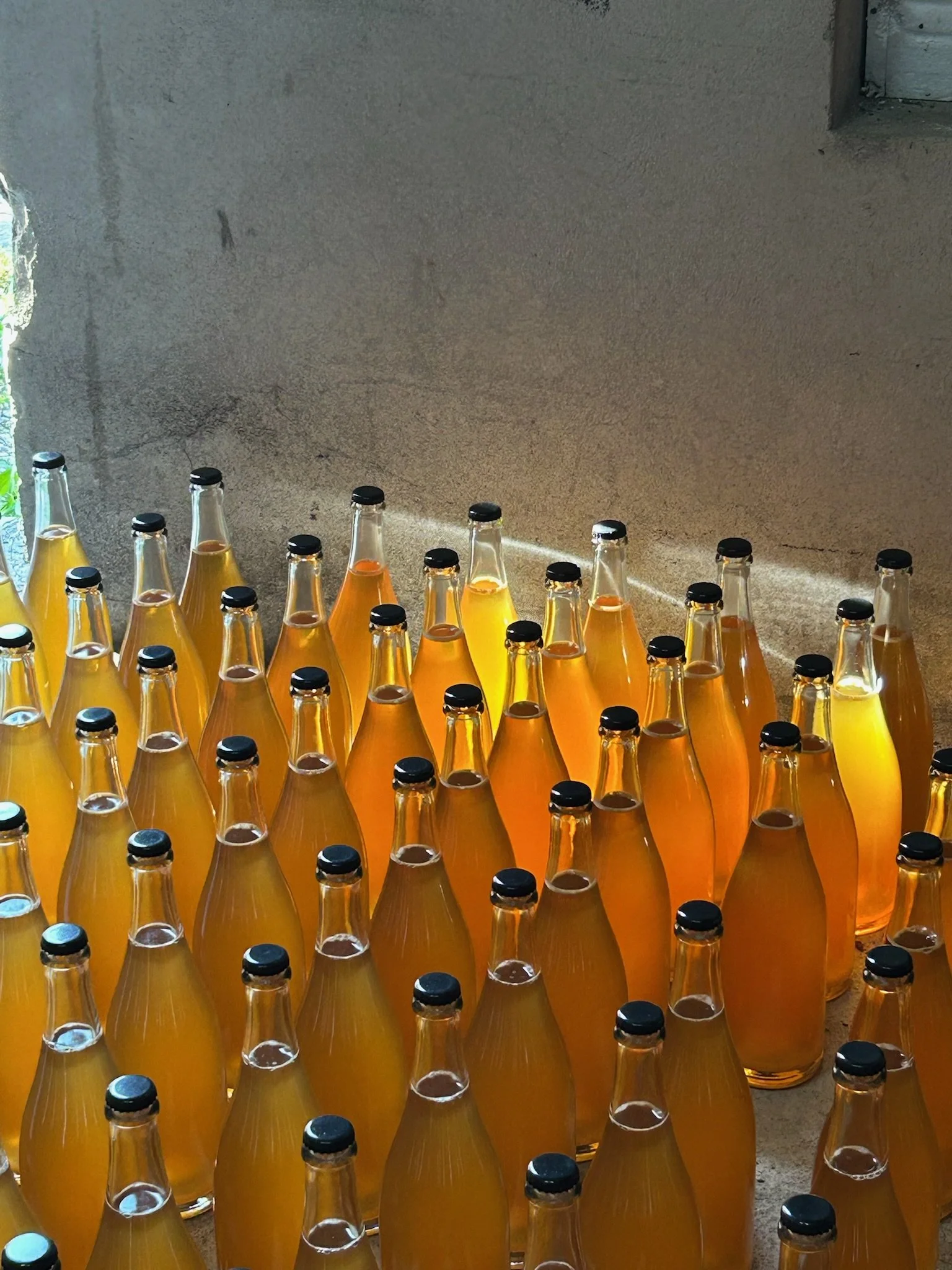 Musten får sen genomgå en första fermentering på vildjäst i flaskan. Därefter pastöriseras den lätt.